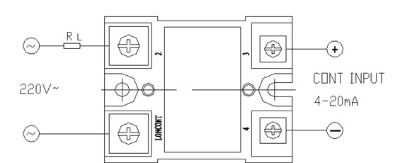 調(diào)壓器內(nèi)部①②端為可控硅電路,分為雙向可控硅普通型、單相可控硅反并增強(qiáng)型和單相可控硅半波型。其中半波型只對(duì)交流電壓的正半周調(diào)壓(模塊內(nèi)部單向可控硅的陽極接①端,陰極接②端)。③④端為4-20mA控制輸入,③端接正極,④端接負(fù)極,可以與溫控表或PLC等的4-20mA輸出控制端口匹配。調(diào)壓器輸出電壓隨著控制信號(hào)的強(qiáng)弱而線性變化。