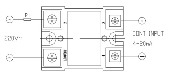 調(diào)壓器內(nèi)部①②端為可控硅電路,分為雙向可控硅普通型、單相可控硅反并增強(qiáng)型和單相可控硅半波型。其中半波型只對(duì)交流電壓的正半周調(diào)壓(模塊內(nèi)部單向可控硅的陽極接①端,陰極接②端)。③④端為4-20mA控制輸入,③端接正極,④端接負(fù)極,可以與溫控表或PLC等的4-20mA輸出控制端口匹配。調(diào)壓器輸出電壓隨著控制信號(hào)的強(qiáng)弱而線性變化。