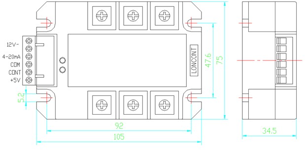 ③、0-5Vdc控制方式:按圖示,可接受單板機(jī)等的0-5Vdc模擬信號(hào),輸入控制正極接cont端、負(fù)極接com端,模塊內(nèi)部cont端相對(duì)com端的輸入阻抗大于30KΩ。采用此方式時(shí)+5V端及‘4-20mA’端懸空。