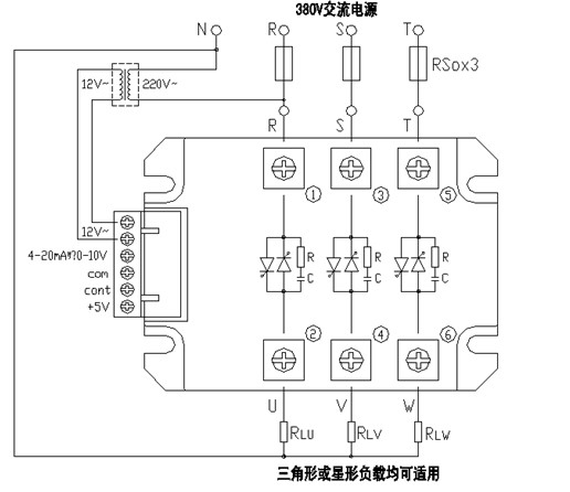 3、模塊適用于電加熱等阻性負(fù)載,負(fù)載Δ形或Y形接法均可,Y形接法時(shí)負(fù)載中心點(diǎn)必須接入N線。