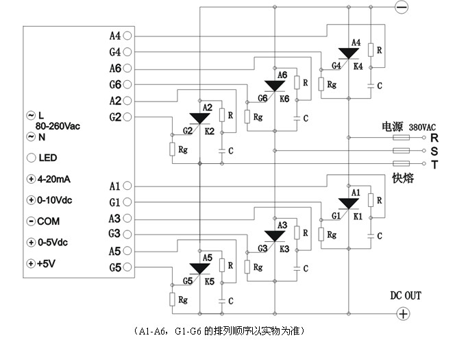 4、三相觸發(fā)器的觸發(fā)端(如A1、G1,……,A6、G6)為單寬脈沖強觸發(fā)方式,可以觸發(fā)額定電流1500A以內(nèi)的任何單向可控硅。強觸發(fā)方式的連線為A1、G1對應(yīng) KPl的陽極和門極,而不是變壓器驅(qū)動方式用的陰極和門極。