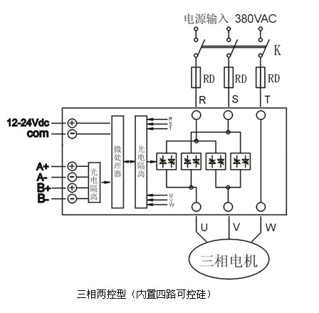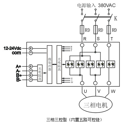 3、三相兩控型內(nèi)置四路可控硅,其中第五路為導(dǎo)線直接接通,當(dāng)模塊關(guān)斷時,380Vac交流強電將仍然直接接入電動機內(nèi),敬請留意。
