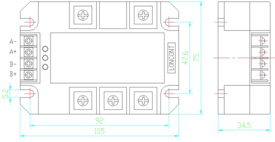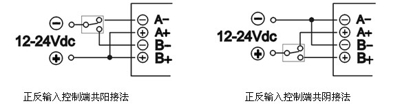 5、輸入控制電壓為12-24Vdc,共陽(yáng)或共陰可任意接線。控制線共陽(yáng)連接時(shí),A—、B—端低電平有效,當(dāng)A—、B—端同時(shí)為低電平時(shí)模塊自動(dòng)關(guān)閉。共陰連接時(shí),A+、B+端高電平有效,當(dāng)A+、B+端同時(shí)為高電平時(shí)模塊自動(dòng)關(guān)閉。其他控制電壓也可定制。
