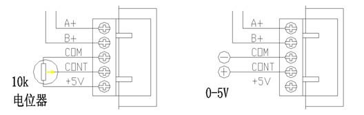 ㈧A型模塊配有調(diào)速功能,在正反切換的同時,可對電機(jī)進(jìn)行雙向速度的10k電位器的手動調(diào)節(jié)或0-5V電壓的自動調(diào)節(jié),cont端的電壓越高則電機(jī)轉(zhuǎn)速越快,還可實(shí)現(xiàn)電機(jī)的緩啟動和緩?fù)V埂?/span>