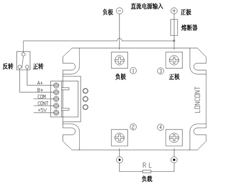 ①和③腳為電源輸入的負(fù)極和正極,②④腳接直流電機(jī)負(fù)載。必要時可接入快速熔斷器